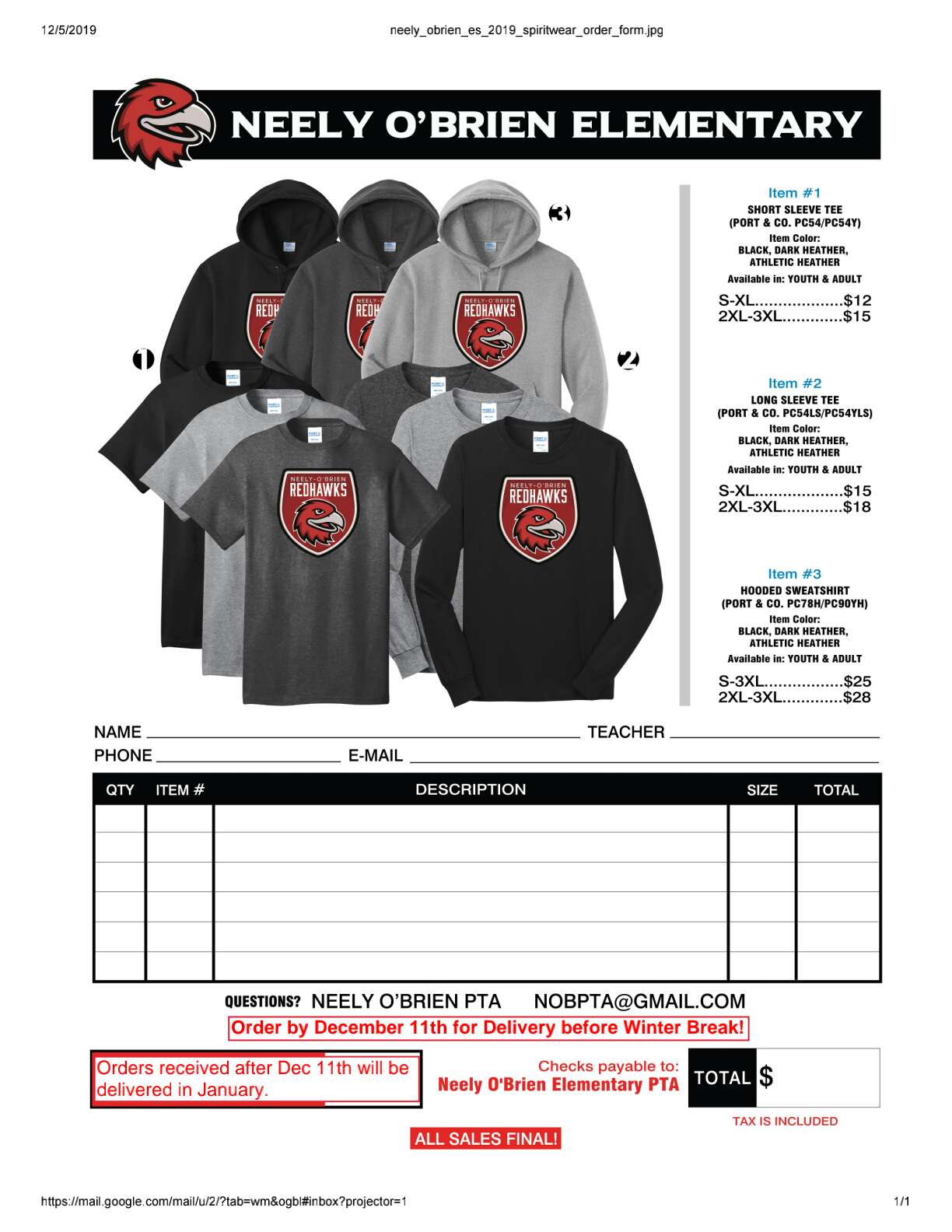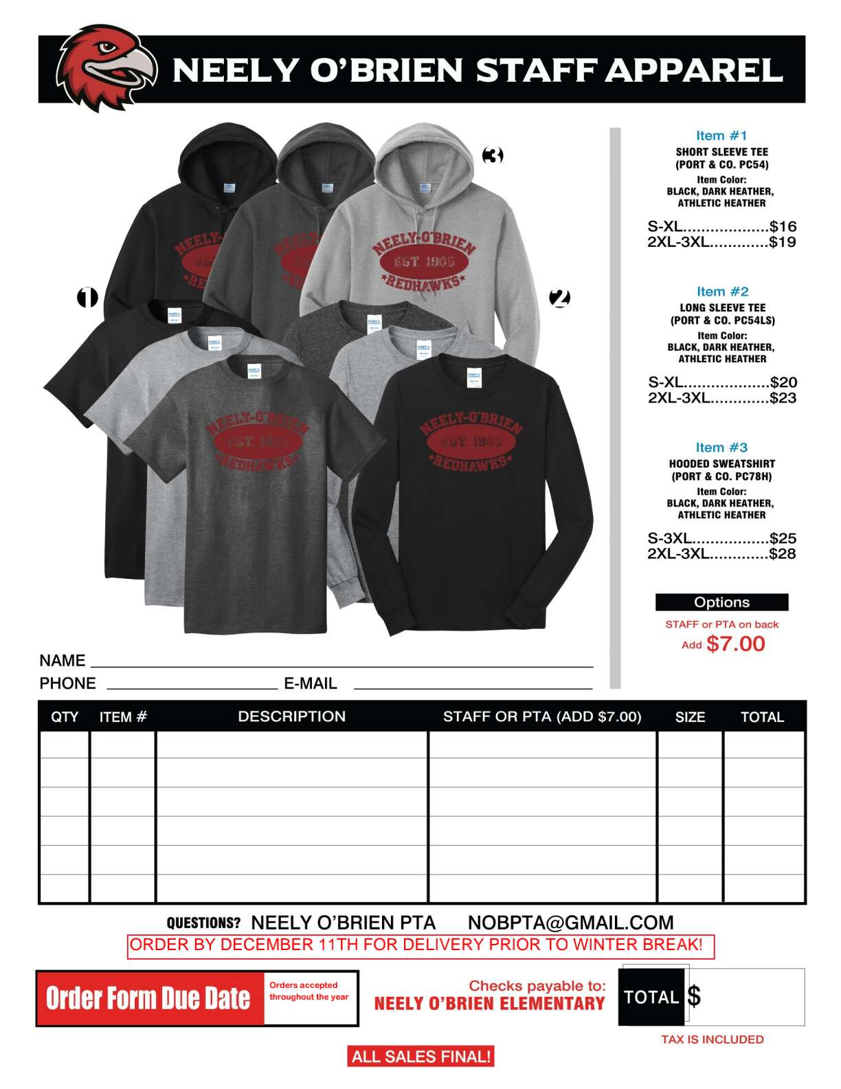 Return your pre-order forms by Dec. 11th with full payment to the Neely O’Brien PTA, and receive your new Neely O’Brien Staff and Student Spirit Wear in January.
