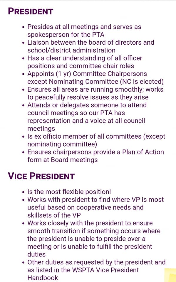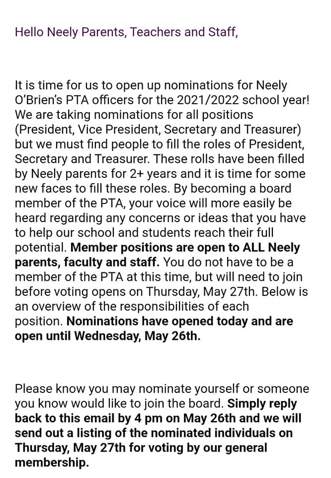 We are now accepting nominations for next school year’s PTA Board! All positions are open! Please get your nominations in by May 26th.