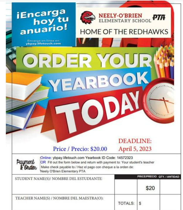 The 2022-2023 Neely O’Brien Elementary Yearbook is available to order NOW with deliveries occurring in June! This yearbook is a great way for your students to remember this school year always!!! Each yearbook is $20 and you can pay online or with a check. You will need to print out the below flyer for all cash/check orders or order online at ybpay.lifetouch.com. Yearbook ID Code: 14572323.Please review the flyer for details and reach out to us at nobptatreasurer@gmail.com with any questions. Thank you!